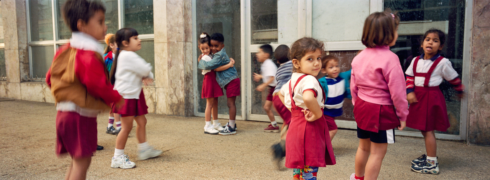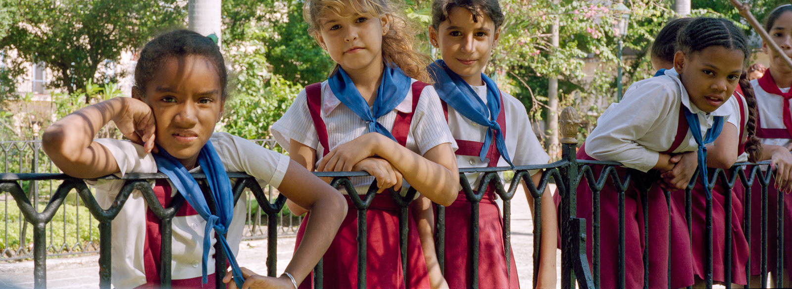 I first travelled to Cuba in late February 2000 with the Maine Photographic Workshops. Although I took my large Fuji 617 panoramic camera expecting to shoot slide film, I had just purchased a 35mm Hasselblad X-pan which could convert to a panoramic format, taking a 24x65mm photo rather than the standard 24x36mm photo. Using the f4/45mm lens, this created a 71° wide angle of view. The challenge was to fill the frame edge to edge with interesting imagery. As this was a range-finder camera, the viewfinder showed me more than the actual image would be, so I could watch the action develop on the edges of the frame, and knew when to press the shutter. I ended up using the Hasselblad almost exclusively on the first trip, and as my only camera on the four subsequent trips. Using the 45mm lens, which is a wide-angle lens on a medium format camera (which the Hasselblad was in panoramic mode), and using Kodak negative film at ISO 400, the brightness of the tropical light allowed me to shoot at f16 at 1/125th of a second. This great depth of field allowed me to set the lens at the "hyperfocal" point, meaning everything in the frame was in focus almost all the time. Further, as a rangefinder camera, I could hand hold the camera at slower speeds when I walked on the shady side of the street. Most photographers visiting Cuba are initially attracted by the old American cars, so I start with those images. The chrome on the front of the Chevys reminded me of a shark's mouth. I then began photographing the elementary school students, who in their red skirts and pants with white shirts, were happy to have their photos taken. However, once they traded in their red clothes for the gold of middle school students, they became more reluctant to be photographed. On one trip I went to Trinidad, in central Cuba, and was struck by the quality and intensity of the light, much like French painters describe their reaction to the light in Provence and along the coast. So I end this portfolio with those images.