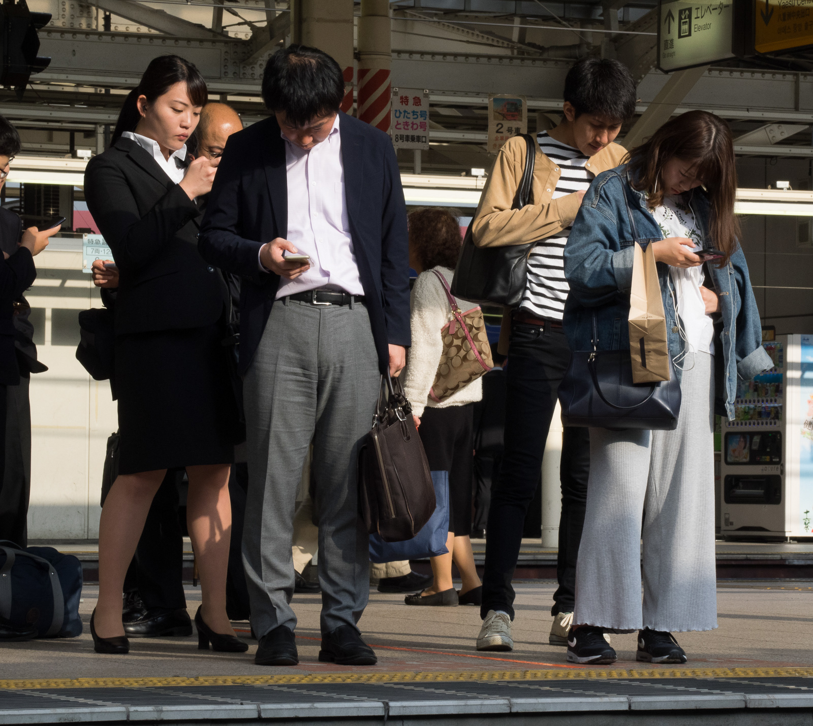 People looking at cellphones while waiting for train, Tokyo Station (Japan 2017-5891) ©Neil A Meyerhoff 2017