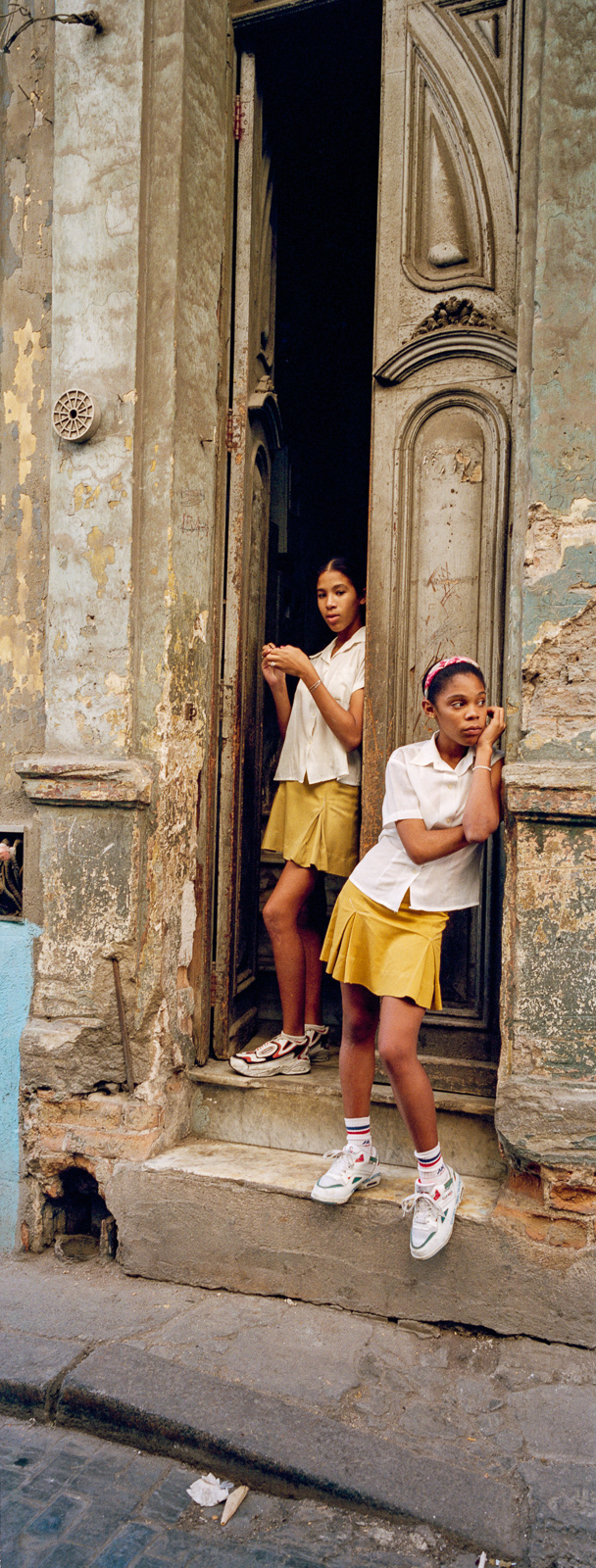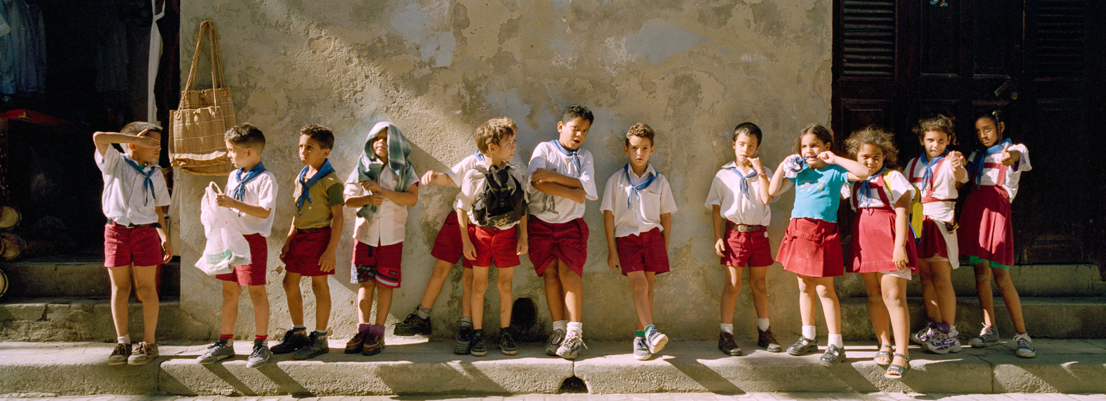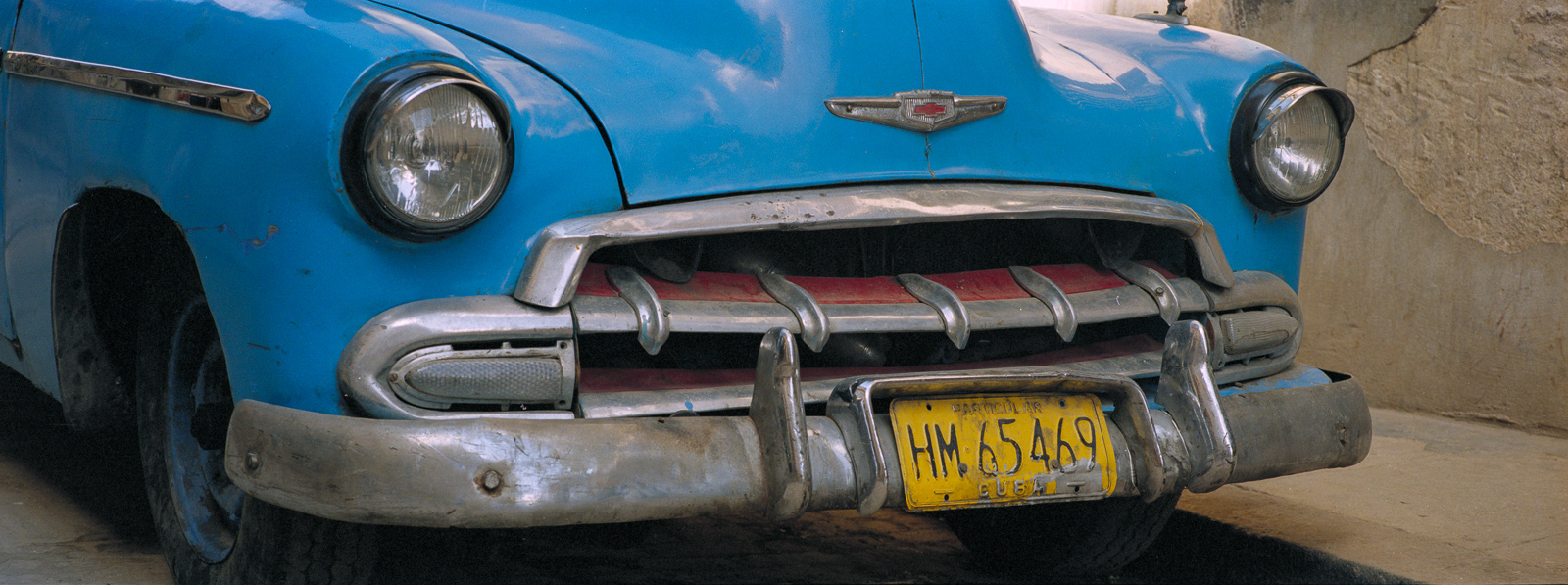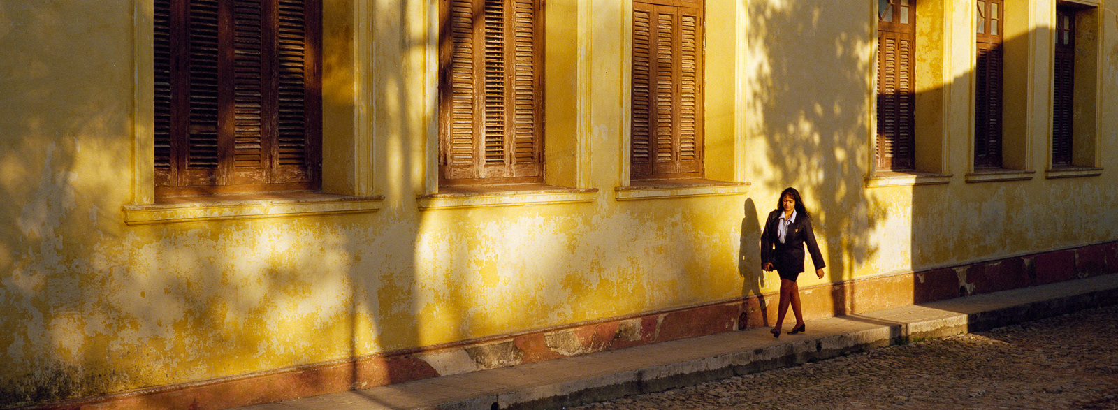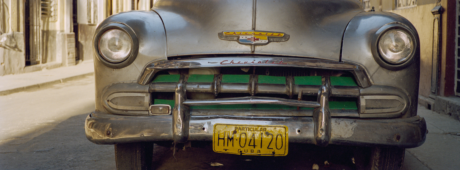 I first travelled to Cuba in late February 2000 with the Maine Photographic Workshops. Although I took my large Fuji 617 panoramic camera expecting to shoot slide film, I had just purchased a 35mm Hasselblad X-pan which could convert to a panoramic format, taking a 24x65mm photo rather than the standard 24x36mm photo. Using the f4/45mm lens, this created a 71° wide angle of view. The challenge was to fill the frame edge to edge with interesting imagery. As this was a range-finder camera, the viewfinder showed me more than the actual image would be, so I could watch the action develop on the edges of the frame, and knew when to press the shutter. I ended up using the Hasselblad almost exclusively on the first trip, and as my only camera on the four subsequent trips. Using the 45mm lens, which is a wide-angle lens on a medium format camera (which the Hasselblad was in panoramic mode), and using Kodak negative film at ISO 400, the brightness of the tropical light allowed me to shoot at f16 at 1/125th of a second. This great depth of field allowed me to set the lens at the "hyperfocal" point, meaning everything in the frame was in focus almost all the time. Further, as a rangefinder camera, I could hand hold the camera at slower speeds when I walked on the shady side of the street. Most photographers visiting Cuba are initially attracted by the old American cars, so I start with those images. The chrome on the front of the Chevys reminded me of a shark's mouth. I then began photographing the elementary school students, who in their red skirts and pants with white shirts, were happy to have their photos taken. However, once they traded in their red clothes for the gold of middle school students, they became more reluctant to be photographed. On one trip I went to Trinidad, in central Cuba, and was struck by the quality and intensity of the light, much like French painters describe their reaction to the light in Provence and along the coast. So I end this portfolio with those images.