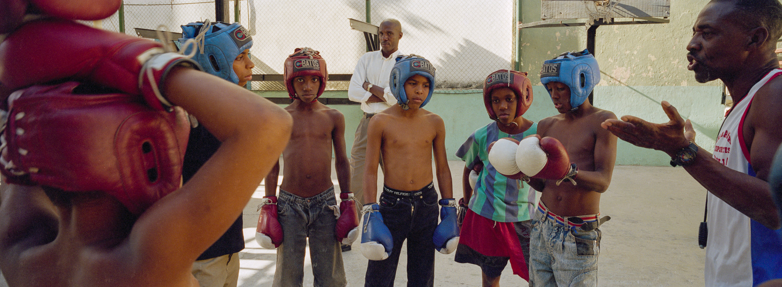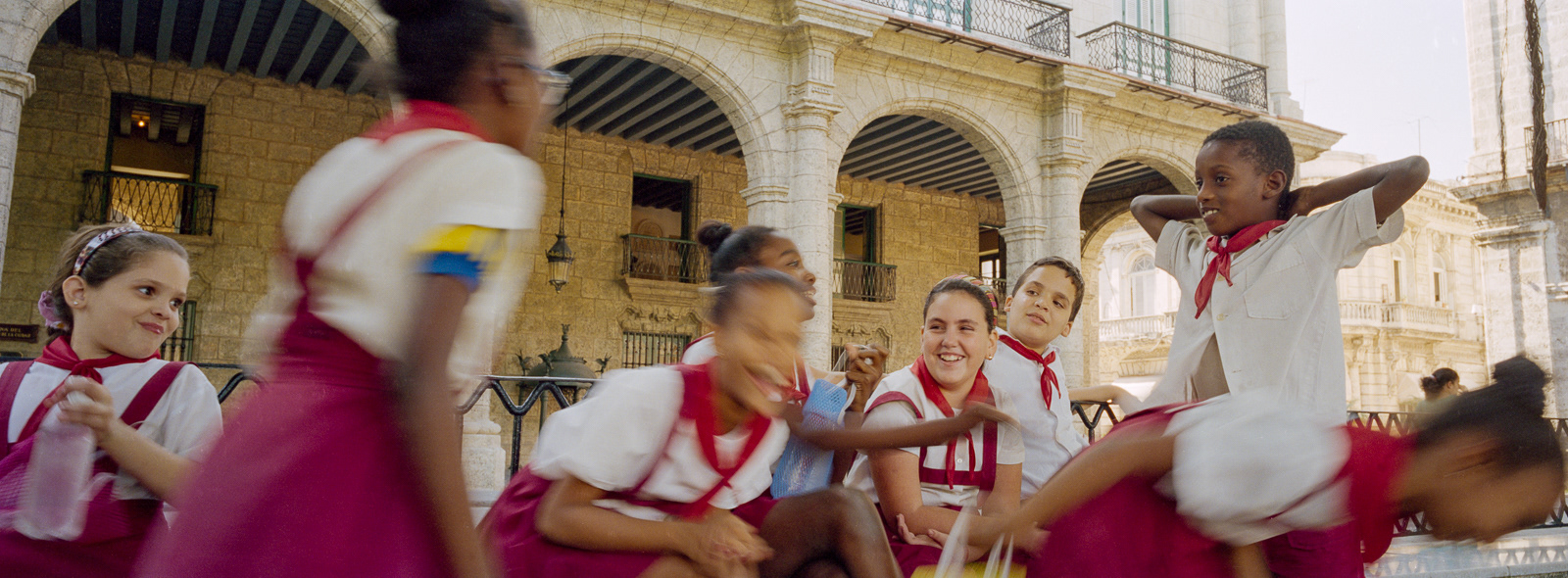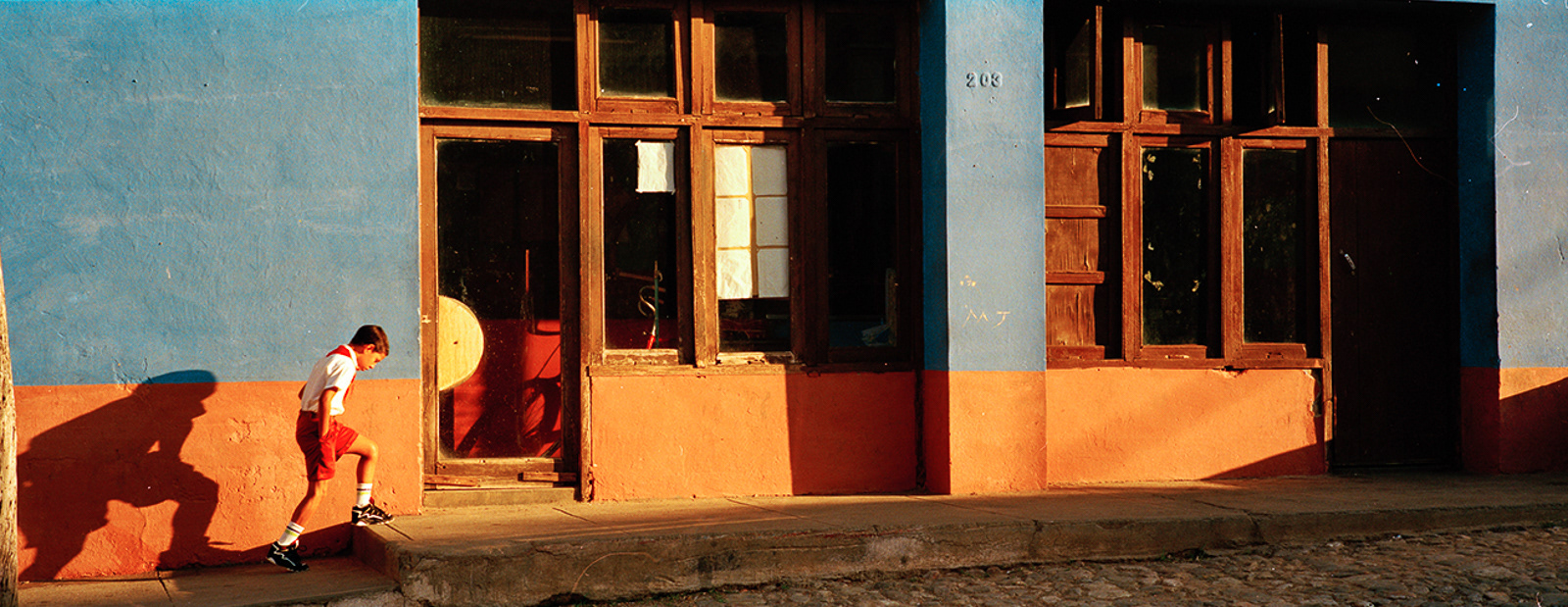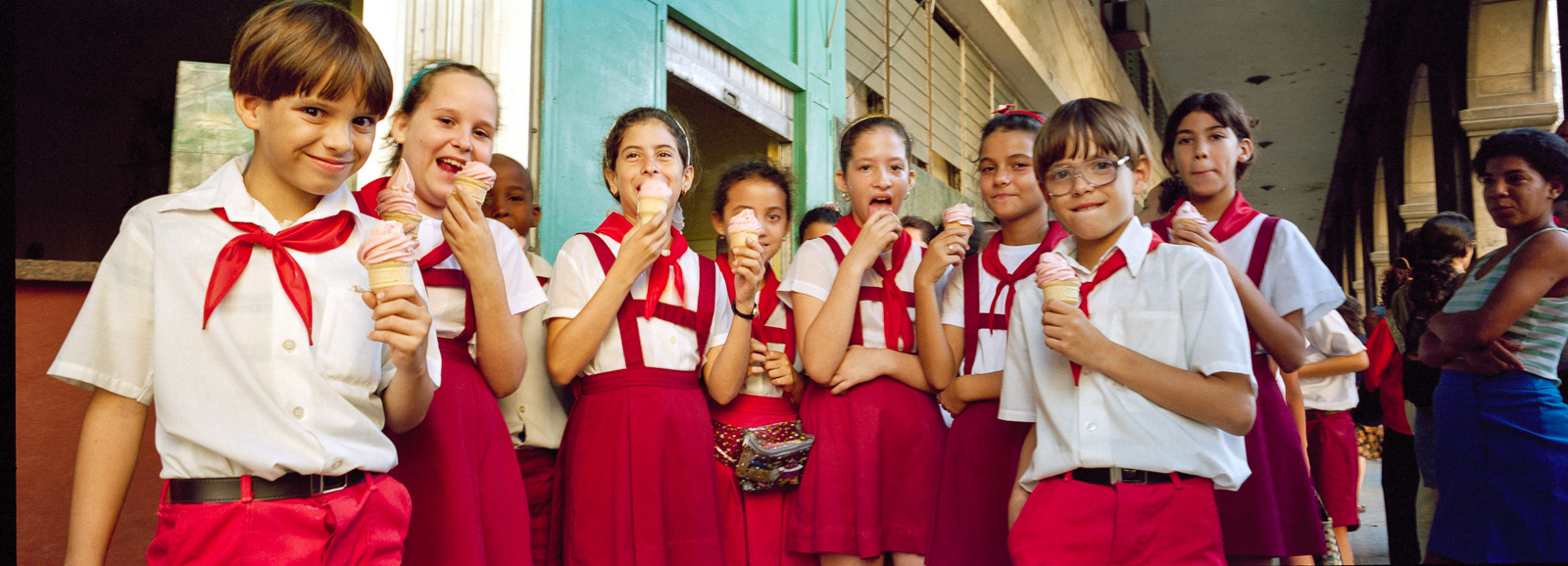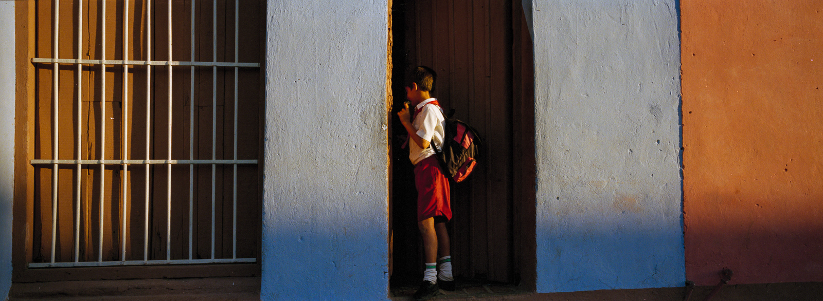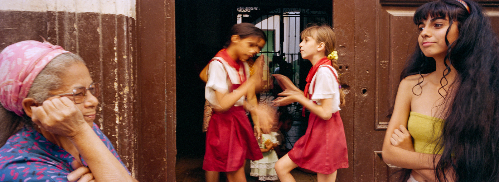 I first travelled to Cuba in late February 2000 with the Maine Photographic Workshops. Although I took my large Fuji 617 panoramic camera expecting to shoot slide film, I had just purchased a 35mm Hasselblad X-pan which could convert to a panoramic format, taking a 24x65mm photo rather than the standard 24x36mm photo. Using the f4/45mm lens, this created a 71° wide angle of view. The challenge was to fill the frame edge to edge with interesting imagery. As this was a range-finder camera, the viewfinder showed me more than the actual image would be, so I could watch the action develop on the edges of the frame, and knew when to press the shutter. I ended up using the Hasselblad almost exclusively on the first trip, and as my only camera on the four subsequent trips. Using the 45mm lens, which is a wide-angle lens on a medium format camera (which the Hasselblad was in panoramic mode), and using Kodak negative film at ISO 400, the brightness of the tropical light allowed me to shoot at f16 at 1/125th of a second. This great depth of field allowed me to set the lens at the "hyperfocal" point, meaning everything in the frame was in focus almost all the time. Further, as a rangefinder camera, I could hand hold the camera at slower speeds when I walked on the shady side of the street. Most photographers visiting Cuba are initially attracted by the old American cars, so I start with those images. The chrome on the front of the Chevys reminded me of a shark's mouth. I then began photographing the elementary school students, who in their red skirts and pants with white shirts, were happy to have their photos taken. However, once they traded in their red clothes for the gold of middle school students, they became more reluctant to be photographed. On one trip I went to Trinidad, in central Cuba, and was struck by the quality and intensity of the light, much like French painters describe their reaction to the light in Provence and along the coast. So I end this portfolio with those images.