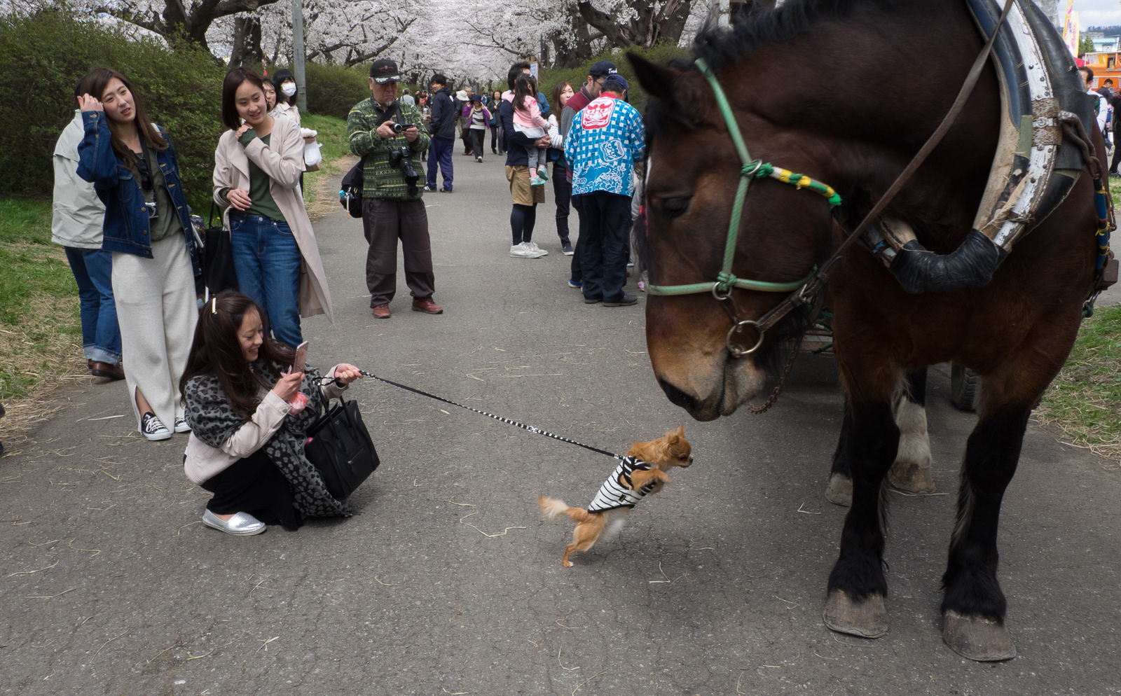 Horse looking at little dog, Kitakami Cherry Blossom festival, Akita Prefecture (Japan 2017-2240) ©Neil A Meyerhoff 2017