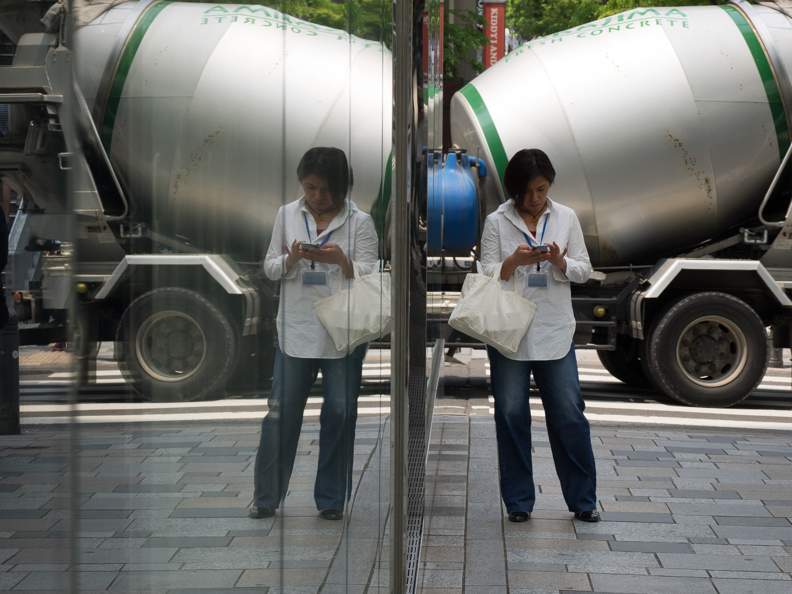Woman reflected in store window with concrete truck, Omote-sando, Harajuku, Tokyo (Japan 2017-5390) ©Neil A Meyerhoff 2017